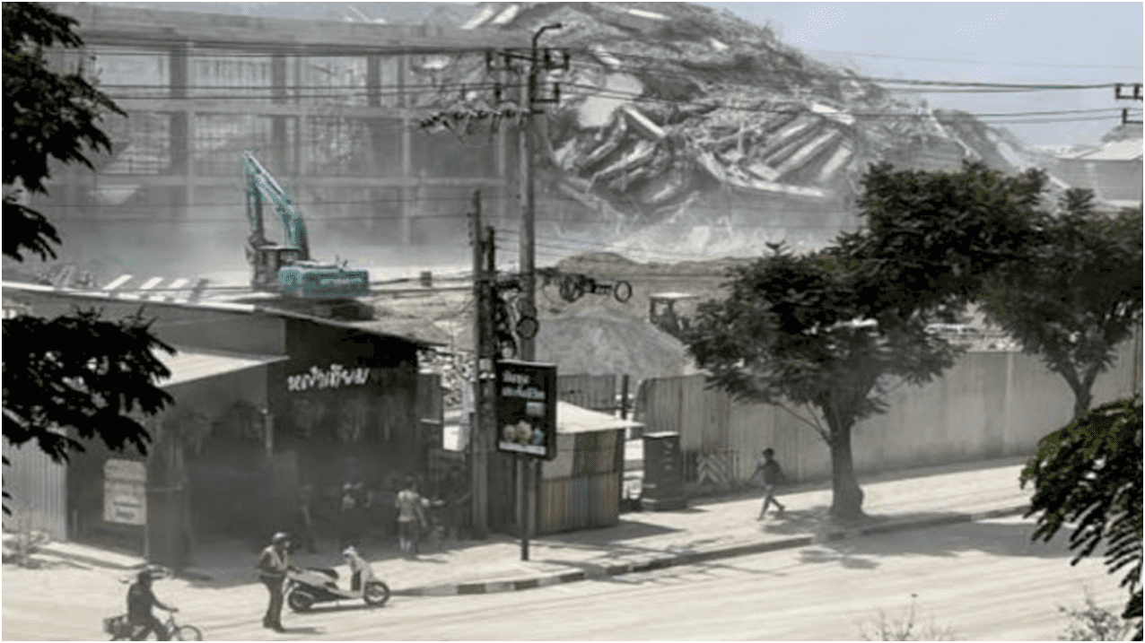 सोशल मीडिया पर बैंकॉक की एक बहुमंजिला इमारत के ढहने का वीडियो वायरल हो रहा है। वीडियो में धूल के गुबार के बीच इमारत गिरती नजर आ रही है और लोग चीखते-चिल्लाते हुए भाग रहे हैं। चाटूचाक मार्केट के पास हुए इस हादसे में राहत कार्य जारी है।