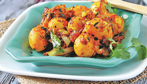 4 उबले अंडे, 1/2 टी स्पून काली मिर्च, 1/2 टी स्पून हल्दी पाउडर, 1/2 टी स्पून लाल मिर्च पाउडर, 1/2 टी स्पून चाट मसाला, 2 हरी मिर्च, 4-5 कढ़ी पत्ते, 1 प्याज (टुकड़ों में कटा हुआ), 1 टेबल स्पून अदरक-लहसुन का पेस्ट