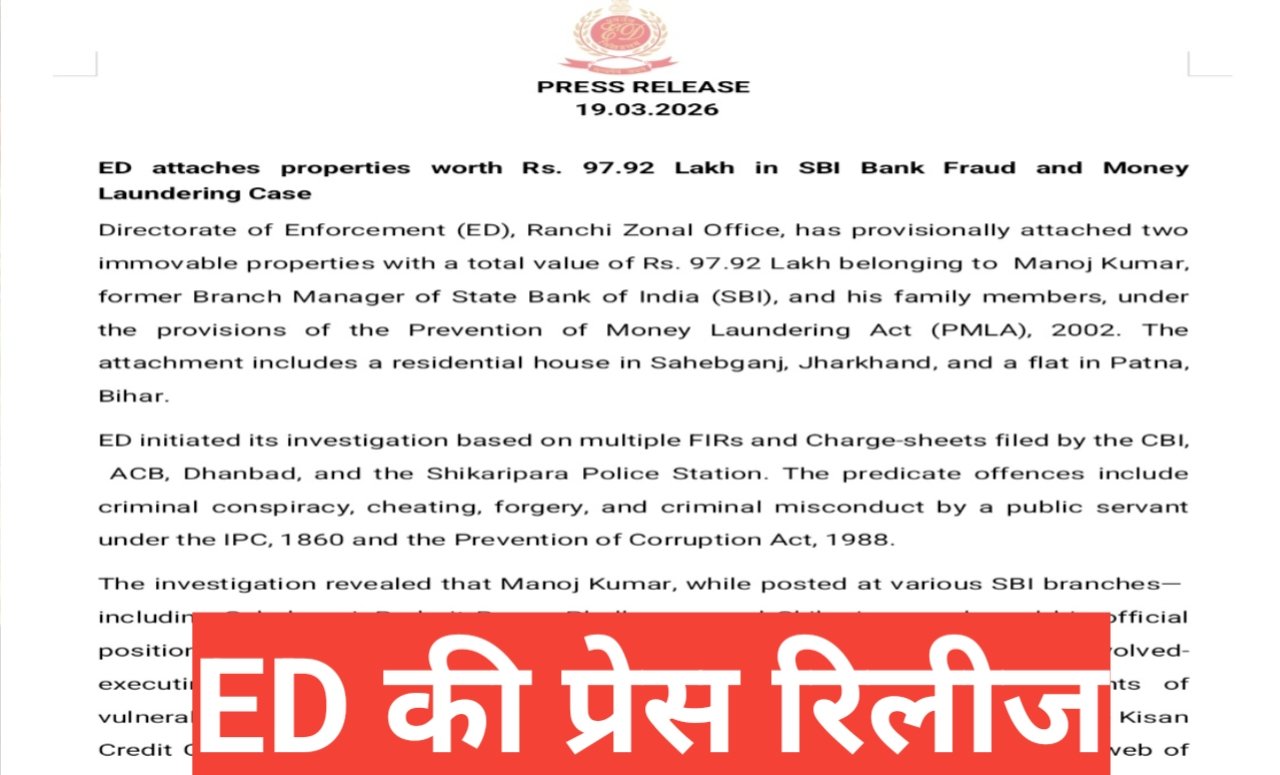 प्रवर्तन निदेशालय ने मनी लॉन्ड्रिंग और बैंक धोखाधड़ी के खिलाफ बड़ी कार्रवाई की है। ED के रांची स्थित कार्यालय ने Prevention of Money Laundering Act (PMLA), 2002 के अंतर्गत पूर्व शाखा प्रबंधक मनोज कुमार और उनके परिवार की दो अचल संपत्तियों को अटैच किया है, जिनकी कुल कीमत 97.92 लाख रुपये है। जब्त की गई संपत्तियों में झारखंड के साहेबगंज जिले में एक आवासीय मकान और बिहार के पटना में एक फ्लैट शामिल हैं।