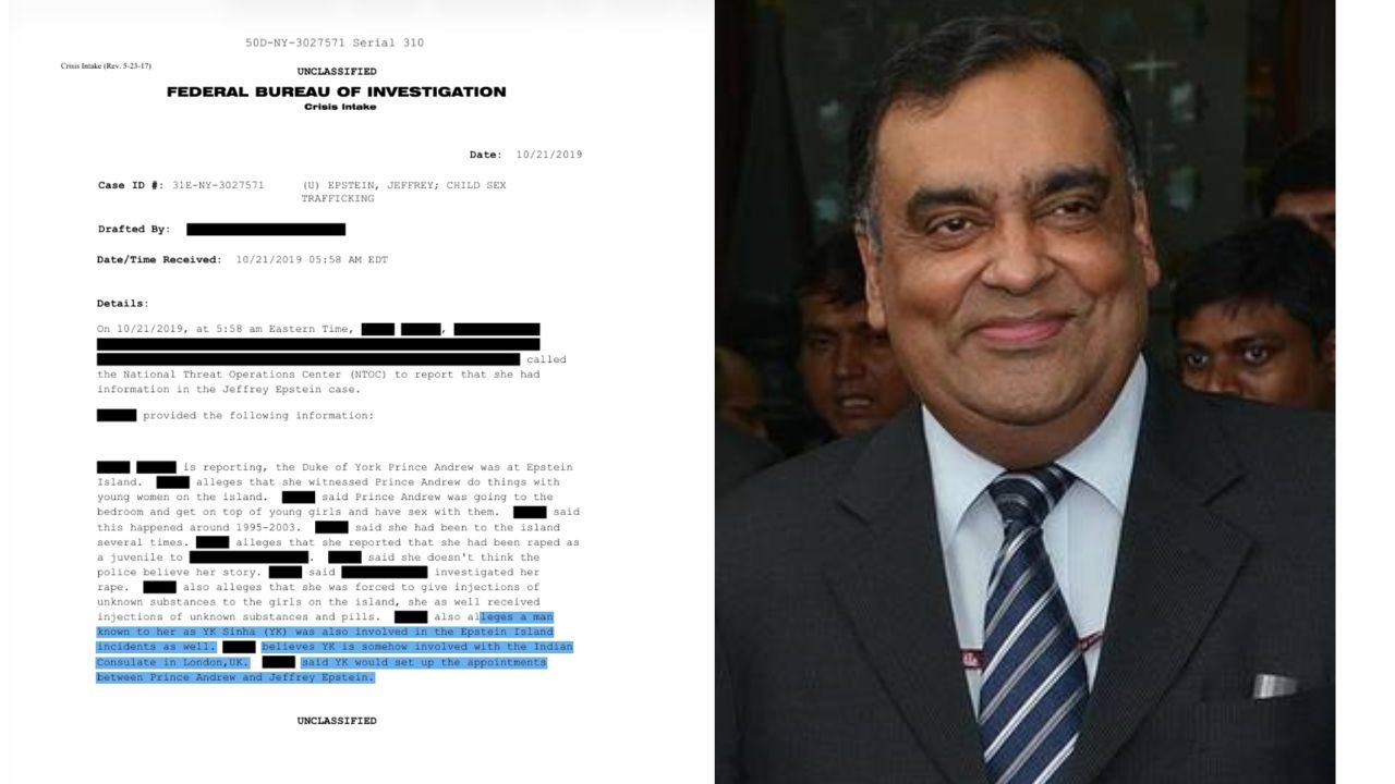 इसके साथ ही, रिपोर्ट में यह भी कहा गया है कि “YK” नामक व्यक्ति, जिसे शिकायतकर्ता ने यशवर्धन कुमार सिन्हा के रूप में पहचाना, इन घटनाओं में किसी न किसी प्रकार से शामिल था। दस्तावेज़ में यह भी उल्लेख किया गया है कि YK का संबंध लंदन स्थित भारतीय कांसुलेट/दूतावास से था और वह कथित रूप से प्रिंस एंड्रयू और जेफरी एपस्टीन के बीच मुलाकातों की व्यवस्था करता था।