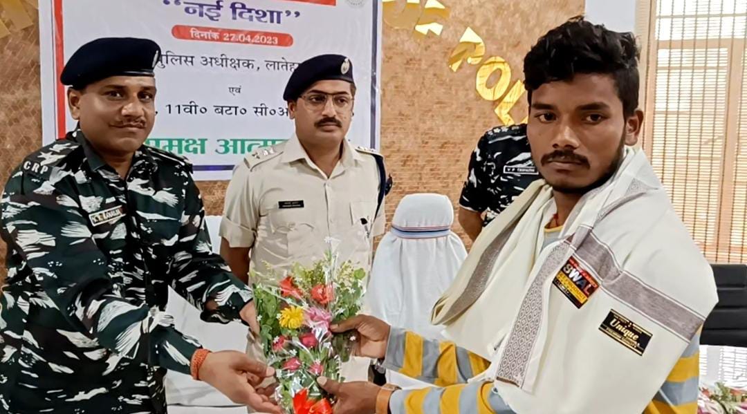 लातेहार पुलिस को बड़ी सफलता हाथ लगी है. जेजेएमपी के एरिया कमांडर सत्येंद्र उरांव उर्फ अभिमन्यु उर्फ मामा ने आत्मसमर्पण कर दिया. सत्येंद्र उरांव ने आज गुरुवार को पुलिस अधीक्षक अंजनी अंजन व सीआरपीएफ के 11वीं बटालियन के कमांडेंट वेद प्रकाश शर्मा और द्वितीय कमान अधिकारी विनोद कुमार कनौजिया के समक्ष पुलिस मुख्यालय में सरेंडर किया. पुलिस अधिकारियों ने सत्येंद्र उरांव को बुके व शॉल भेंट किया. मौके पर सत्येंद्र ने कहा कि सरकार की आत्मसमर्पण एवं पुर्नवास नीति से प्रेरित होकर उसने सरेंडर किया है.