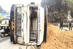 जमशेदपुर। साकची थाना क्षेत्र के मरीन ड्राइव गोलचक्कर के पास देर रात एक बालू लदा हाइवा पलट गया। इस घटना से हाइवा में लदा बालू भी सड़क पर बिखर गया। घटना के बाद चालक हाइवा छोड़ फरार हो गया। सूचना पाकर साकची पुलिस मौके पर पहुंची और क्रेन की मदद से सड़क पर पलटी हाइवा को सीधा कर थाने ले गई। साकची थाने में हाइवा के मालिक को बुलाकर कागजात की जांच की गई। जांच में सभी कागजात सभी पाए गए। मिली जानकारी के अनुसार हाइवा मरीन ड्राइव से होते हुए पुराना कोर्ट को ओर जा रही थी। मरीन ड्राइव गोलचक्कर के पास मुड़ने के दौरान हाइवा अनियंत्रित होकर सड़क पर पलट गई।