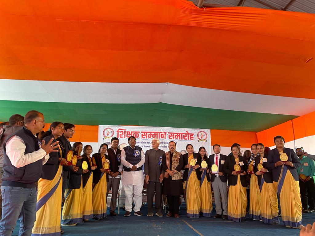 आज रांची विश्वविद्यालय के दीक्षांत मंडप में किया गया राज्य में शिक्षकों के लिए आयोजित सबसे बड़े सम्मान समारोह में झारखंड के विभिन्न हिस्सों से आए लगभग 2000 से अधिक शिक्षकों को सम्मानित किया गया प्राइवेट स्कूल एंड चिल्ड्रन वेलफेयर एसोसिएशन पाठवा के द्वारा आयोजित शिक्षक सम्मान समारोह में मुख्य अतिथि के रूप में राज्य के वित्त एवं खाद्य आपूर्ति मंत्री डॉ रामेश्वर उरांव पासवा के राष्ट्रीय अध्यक्ष समायल अहमद रिनपास के निदेशक डॉक्टर जयंती सिमलाई ,एलआर सैनी पद्मश्री से सम्मानित मुकुंद नायक पासवा के प्रदेश अध्यक्ष के प्रदेश अध्यक्ष आलोक कुमार दुबे उपाध्यक्ष लाल किशोर नाथ शहदेव महासचिव डॉ राजेश गुप्ता जिला अध्यक्ष अरविंद कुमार डॉ सुषमा क्रिकेटर , फलक फ़ातिमा , संजय कुमार ,आलोक विपिन टोप्पो मुजाहिद आलम , राशिद इकबाल अल्ताफ अंसारी, रणधीर कौशिक एवं निजी स्कूल के संचालक एवं शिक्षक उपस्थित थे ।