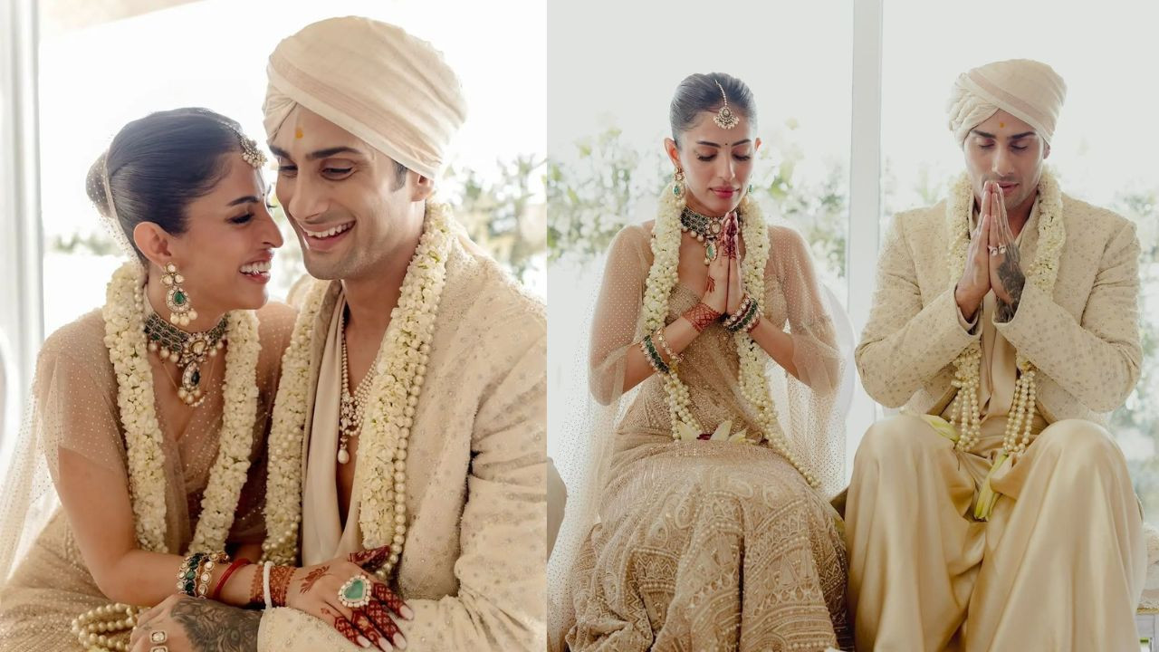 शजान पद्मसी ने बिजनेसमैन आशीष कनकिया से एक प्राइवेट सेरेमनी में शादी की, जिसमें उन्होंने एक अनोखा आइवरी और पिंक लहंगा पहना था, जिस पर बारीक कटवर्क कढ़ाई थी। चमचमाती ज्वेलरी ने उनके फेमिनिन लुक की खूबसूरती को और बढ़ा दिया।
